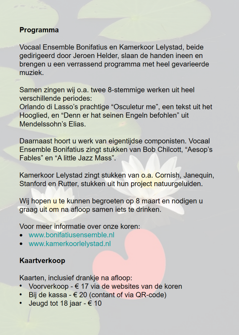 - Kamerkoor Lelystad neemt u mee de natuur in met hun project "Natuurgeluiden", inclusief werk van grootmeesters als John Rutter en Charles Villiers Stanford.